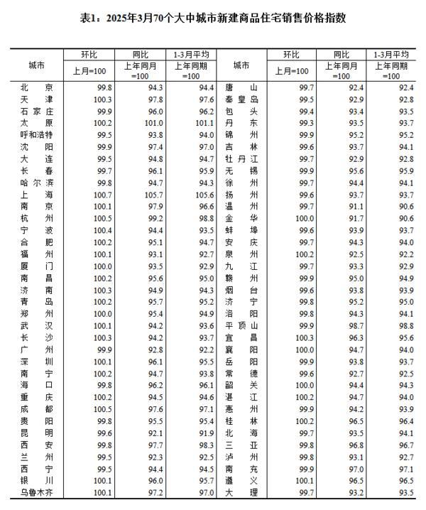 国家统计局城市司首席统计师王中华表示,2025年3月份,住房市场成交活跃度提升,70个大中城市中,商品住宅销售价格环比上涨城市个数增加;一线城市商品住宅销售价格环比上涨,二三线城市环比总体降幅收窄;各线城市同比降幅均继续收窄。