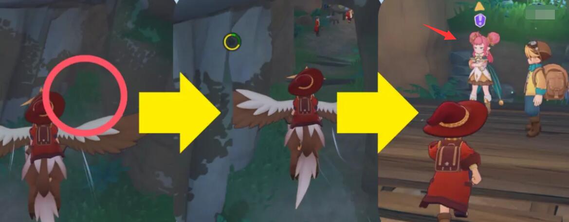 任务需前往商业街附近广场与公主对话接取,首阶段需定位四位带精灵的魔法师。第一位位于月牙镇上方传送点附近,无遮挡可直接交互,第二位在商业街东南角大树后,需绕行树干触发。第三、四位分别在风眠圣所左上角与右上角区域,后者需完成前置对话激活坐标显示。
