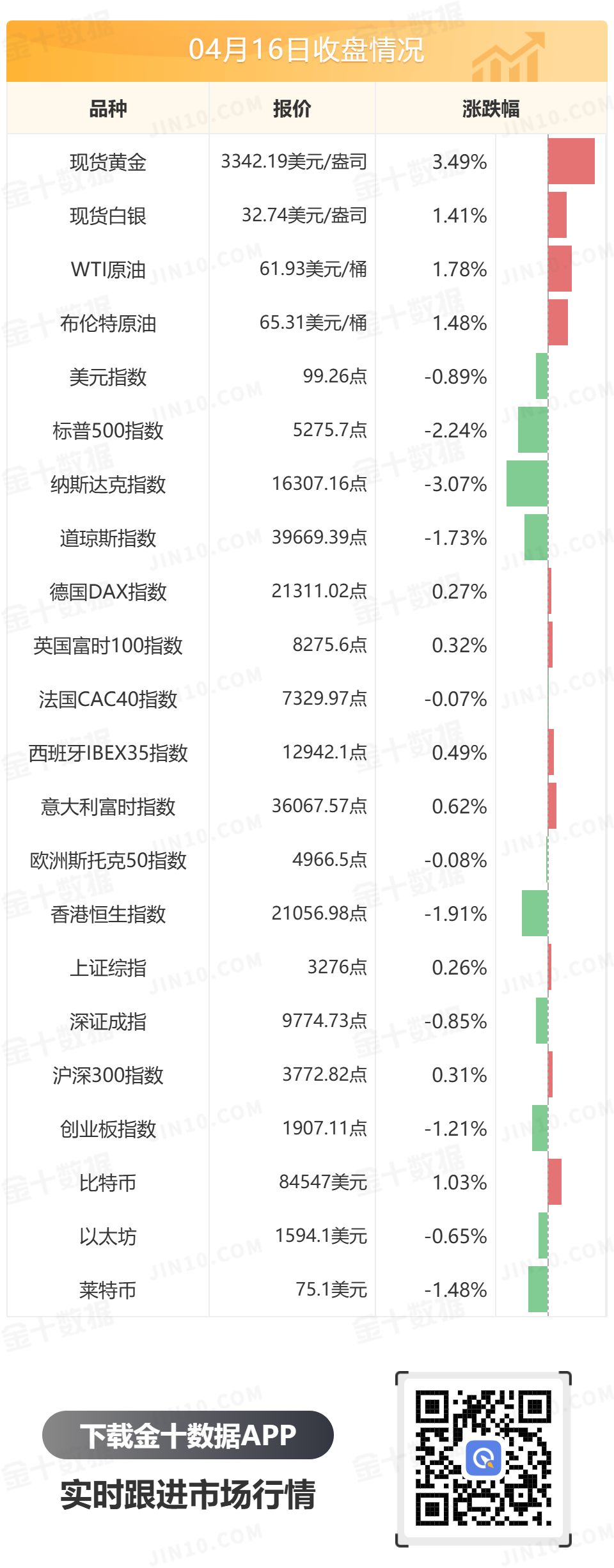 因美元走弱以及贸易紧张局势升级,现货黄金延续创记录涨势,将历史新高刷新至3340美元上方,日内暴涨超100美元,最终收涨3.49%,报3342.19美元/盎司。现货白银收涨1.41%,报32.74美元/盎司。