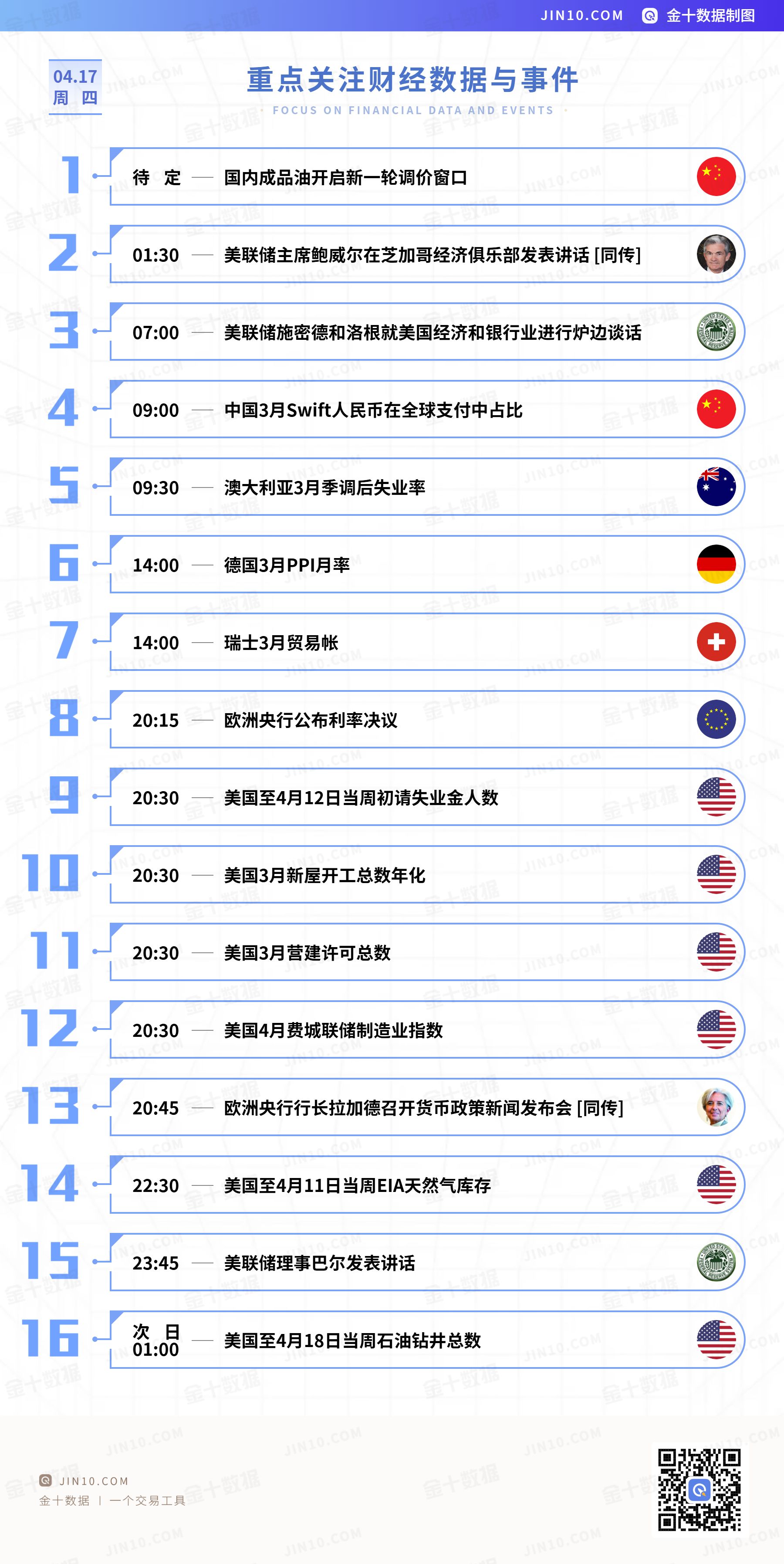 20点30分,美国将公布至4月12日当周初请失业金人数、3月新屋开工总数年化、3月营建许可总数以及4月费城联储制造业指数;