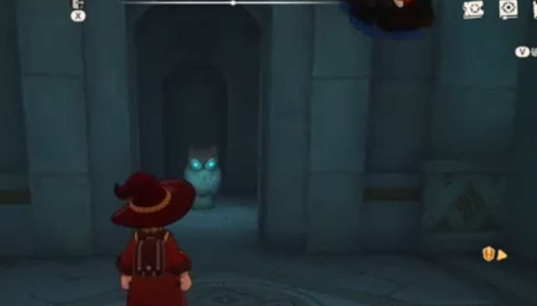 玩家首先要先来风眠圣所到第一个机关这里,先飞到任意一侧平台上面,使用星星魔法棒去攻击猫头鹰,打完猫头鹰后,我们在飞到对面平台上去,在对面平台这里还有只猫头鹰,继续攻击对面平台的猫头鹰,两侧的猫头鹰都打完后,飞回中间的台子上面,等待一下就能看到两边会出现个红格子机关。
