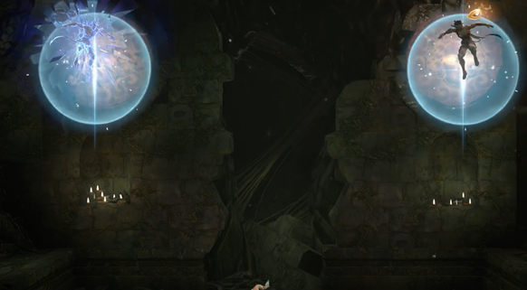 点亮的方法不是攻击,而是要人同时穿过去两个圆圈,这里可以先穿过一个,然后留下分身在那里,快速穿过另一个的时候直接传回去。
