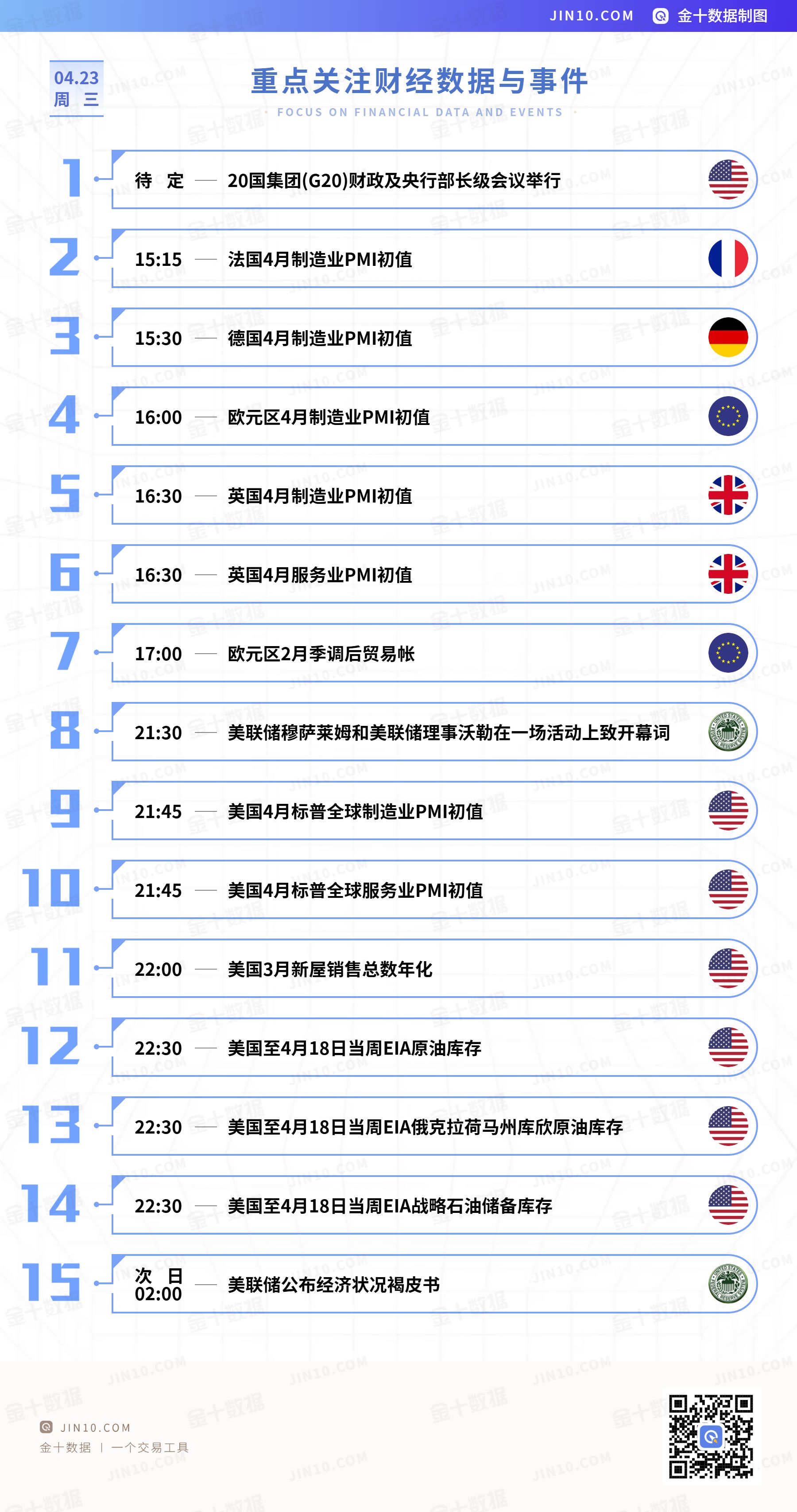 15:15-16:00,法国/德国/欧元区4月制造业PMI初值;