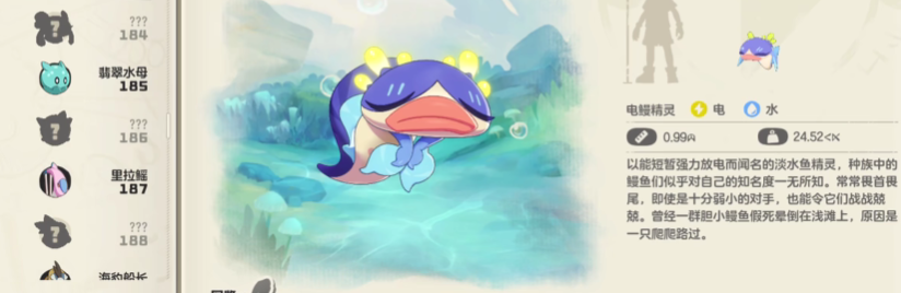 闪电鳗鱼在游戏中也哭通过精灵种子获取,不过获取的是闪电鳗鱼的初始状态。目前在游戏中闪电鳗鱼的最初模样都是初始,需要玩家在后期培养进化就能成为闪电鳗鱼了。闪电鳗鱼拥有水、电、武,各项数值。