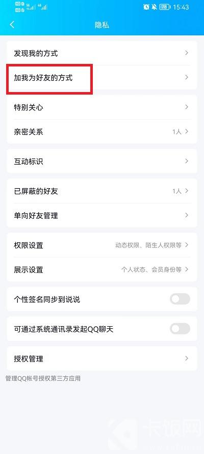 4、之后就可以看到【加我为好友的方式】点击进入;