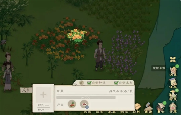 前期粮食比较紧缺,种田产出时间长,需要先采集度过一段时间。