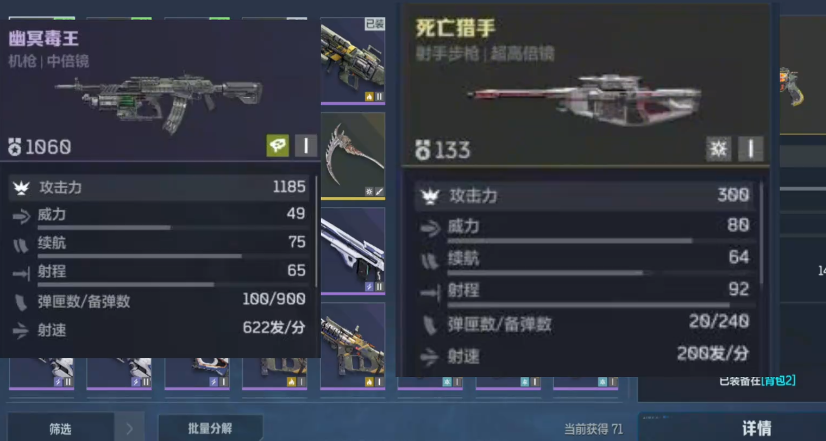幽冥毒王的续航能力比较优秀一些,死亡猎手的威力和射程更优秀一些,大家可以结合这两个枪械的设定,选择最适合的场景使用,另外比较推荐的武器就是暗影之伤,虽然这个看起来只是一个比较常规的手枪,射程不远,整体的弹夹容量也不大,但是这把枪械威力是比较厉害的,并且还会有技能设定,是由这把枪械之后第一发子弹将会产生爆炸效果,这样就从普通攻击变成了带有额外附加属性的攻击。