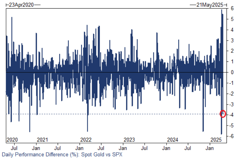 从价格表现来看,现货黄金与标普500之间的表现差距达到近五年来最极端之一,也反映出这次市场情绪的极端。