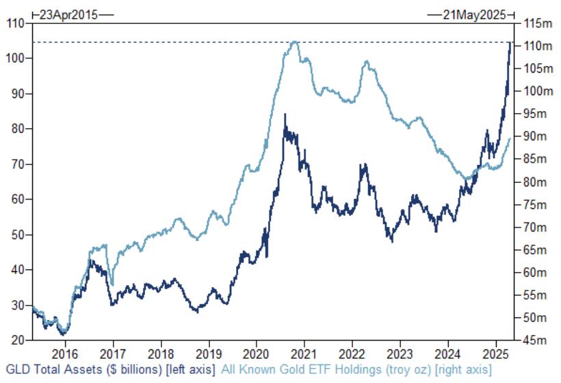 高盛指出,目前黄金ETF的总资产管理规模(AUM)确实处于高位,但ETF实际持有的黄金数量却低于2020年疫情高峰时期。这意味着目前GLD的高估值,主要是金价本身上涨推动的,而非市场持续申购的结果(尽管今年资金流入确实很强劲)。