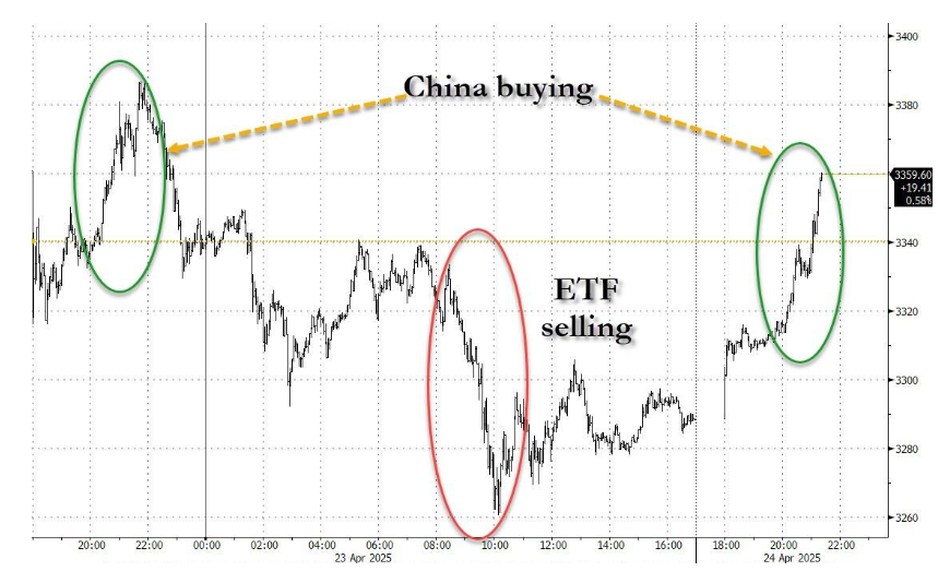 值得注意的是,尽管ETF短期抛压让金价出现两日累计4%的大幅回调,创下历史罕见的“双杀日”,但来自中国的实物买盘再度展现韧性。周四当中国市场开盘后不久,实物黄金需求迅速涌现,在短短几分钟内将金价拉升约40美元,从隔夜低点反弹了接近100美元。