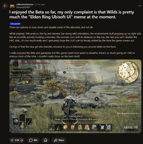 这位玩家还表示,他非常喜欢B测展示出的游戏玩法,但游戏中很多东西导致他大多数时间感到焦虑,无法真正专注于狩猎本身。他还展示了“育碧版《艾尔登法环》UI梗图”,称《怪物猎人:荒野》的界面设计也有类似的问题。