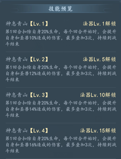 神息青山【Lv.4】法器Lv.15解锁第1回合扣除自身20%生命,每个回合开始时,会提升自身和圣兽16%造成的伤害,最多叠加3次,持续到战斗结束