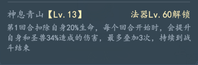 神息青山【Lv.13】法器Lv.60解锁第1回合扣除自身20%生命,每个回合开始时,会提升自身和圣兽34%造成的伤害,最多叠加3次,持续到战斗结束