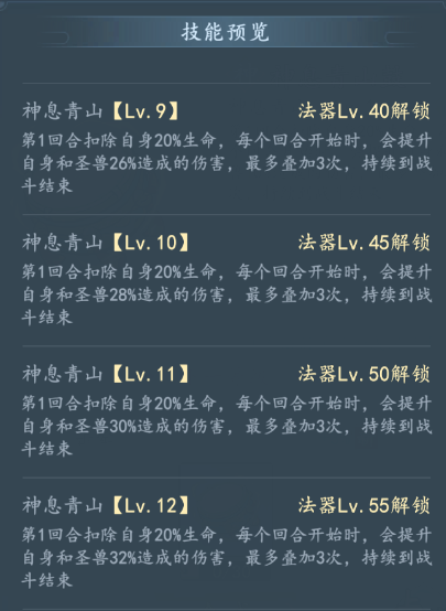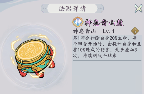神息青山【Lv.9】法器Lv.40解锁第1回合扣除自身20%生命,每个回合开始时,会提升自身和圣兽26%造成的伤害,最多叠加3次,持续到战斗结束