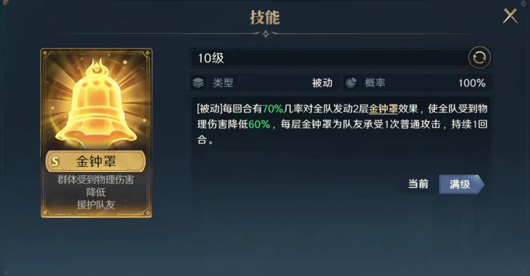 自带技能【金钟罩】:每回合有70%的概率为我方全体施加2层金钟罩效果,使全队受到物理伤害降低60%,每层金钟罩为队友承受1次普通攻击,持续1回合。
