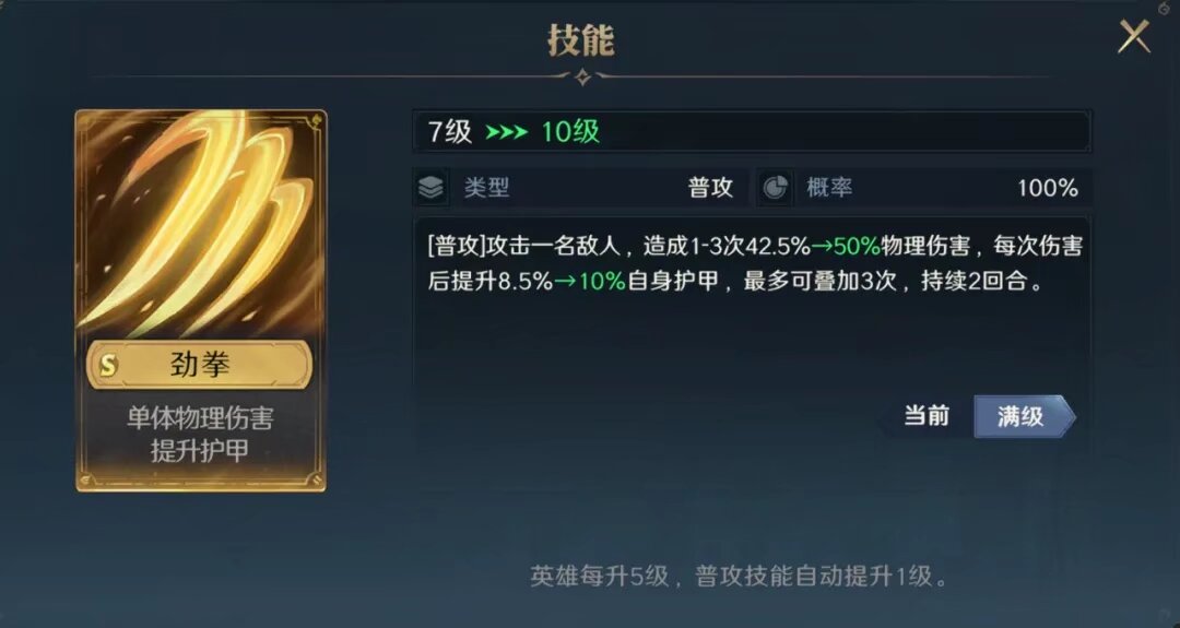 普攻技能:攻击一名敌人造成1-3次物理伤害,每次伤害提升自身10%护甲,最多可叠加3次,持续2回合。
