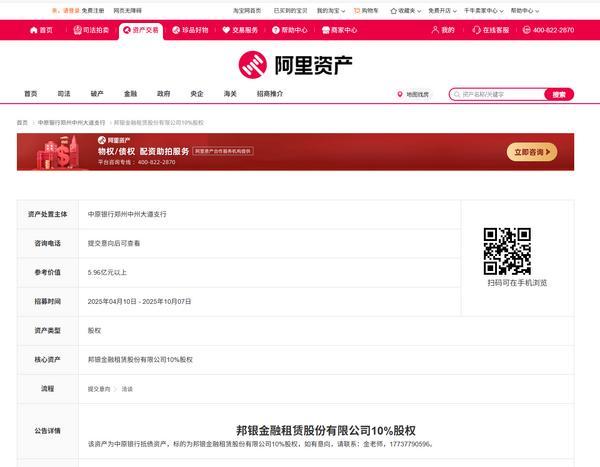 财经4月25日讯 目前,据阿里拍卖平台披露相关公告显示,该平台上架了一笔邦银金融租赁股份有限公司(下称“邦银金租”的股权招商信息,邦银金租10%的股权将被转让,参考价值为5.96亿元,意向者招募时间为4月10日至10月7日,处置主体是中原银行郑州中州大道支行。公告详情披露,该资产为中原银行抵债资产,标的为邦银金融租赁股份有限公司10%股权。