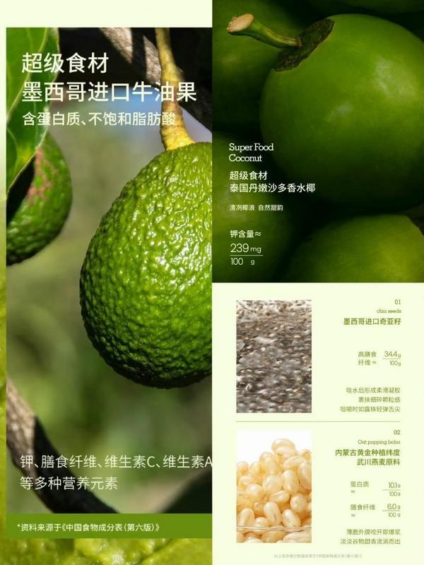 奈雪当季green系列的6款产品,从品类上来看,很难用奶茶、果茶、甚至蔬果茶来界定,几款产品最大的共同点就是均使用了“超级食材”。高膳食纤维如羽衣甘蓝、墨西哥进口奇亚籽,高蛋白如湖畔毛豆、武川燕麦,富含电解质的泰国香椰、墨西哥进口牛油果、径山抹茶等等,奈雪的原料研发不拘一格,纵横捭阖在“茶”“果”“蔬”“谷”中,只要是健康食材,都可为其所用。