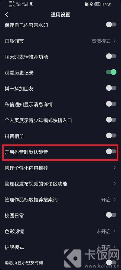 4、在通用设置的界面中,就可以看到下方会有一个【开启抖音时默认静音】功能,点击打开该功能按钮,就可以完成设置。