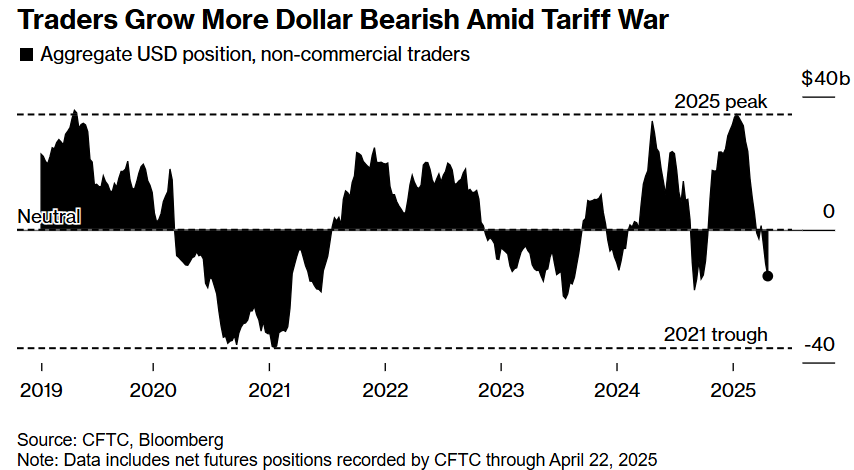 4月份,包括对冲基金和资产管理公司在内的投机交易商加大了对美元的押注。CFTC数据显示,在截至4月22日的一周内,该群体看空美元的押注价值约为139亿美元,是自2024年9月以来最看空的程度。