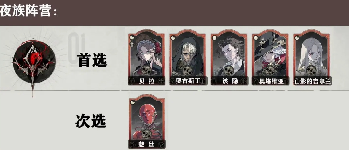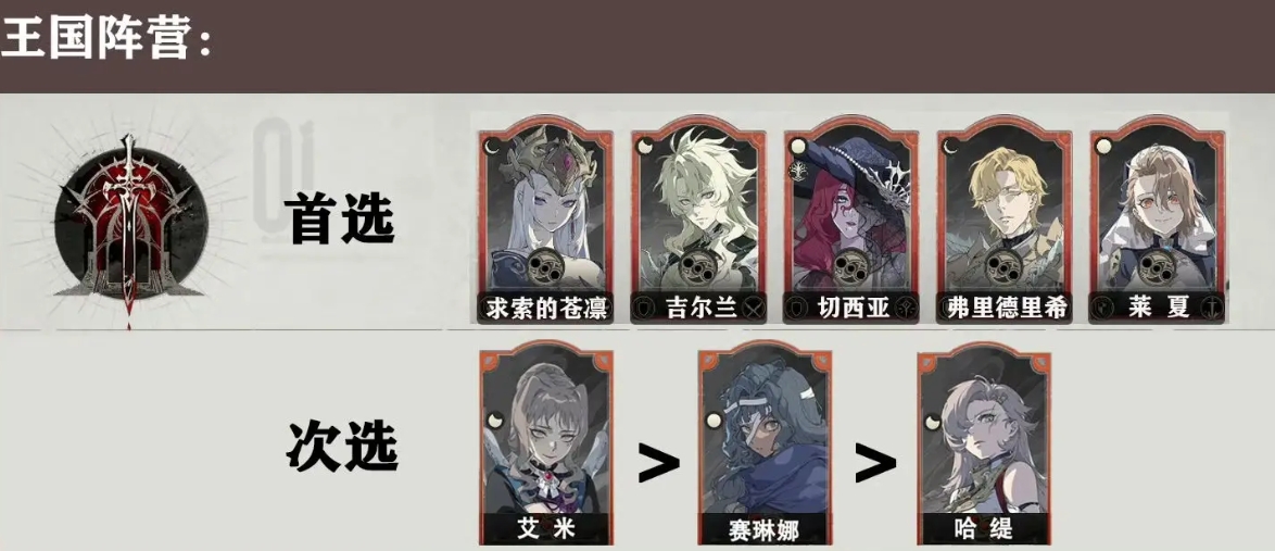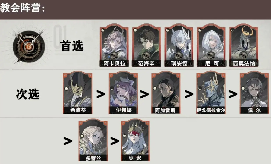 首先就是建议大家在教会阵营中,首选角色建议为阿卡贝拉、范海辛、琪安德、尼可、西奥法纳,次选角色中,希波蒂是不少玩家的备选之一,还有伊甸娜、阿加雷斯、伊戈德拉希尔、佩尔、多蕾丝和琼安也值得考虑,夜族阵营的首选角色包括贝拉、该隐、吉尔兰等卡牌,而王国阵营当中,大家可以看到的的比较推荐的是求索的苍凛、吉尔兰、切西亚、弗里德里希、莱夏等作用较大的角色,次选角色中,艾米和赛琳娜因外观可爱且突袭能力不错而备受推荐,而哈缇也是不少玩家的选择。