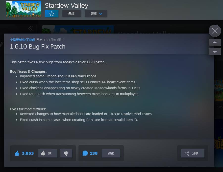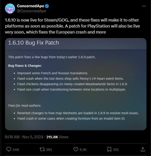 随后,他为Steam和GOG平台的《星露谷物语》发布了1.6.10版本补丁,修复了小鸡消失等多个问题,并承诺其他平台的补丁也将尽快上线。
