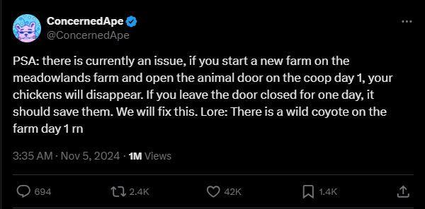 开发者ConcernedApe迅速注意到了这一问题,并在推特上幽默地提醒玩家通过第一天关闭鸡舍大门来避免小鸡“被野生郊狼叼走”。
