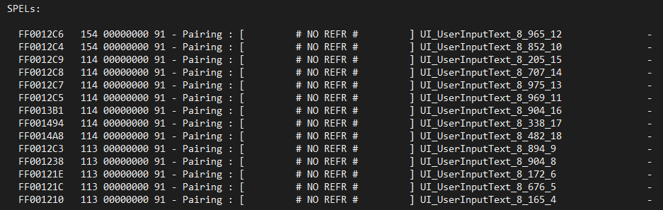 4、这里面几行就是你所有的自制法术,那些FF开头的代码就是你自制法术的ID,后面的“UI_UserInputText_8_965_12”本来应该是你法术的名字,如果是英文的话应该就是原文,但是输入中文会变成UI_UserInputText,没有太好的办法来区分,只能根据序号的顺序来判断或者之后一个一个试。
