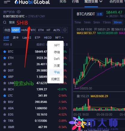 3、选择火币网顶部导航(现货交易,币币交易),搜索框搜索SHIB。
