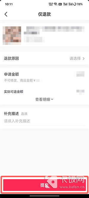 6、选择需要退款的原因、补充描述等,点击【提交】退款申请(如商品已发货、已收获,需要选择仅退款或退货退款再提交);