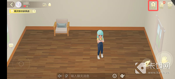 2、进入QQ小窝后就会进入自己的房间,点击右上角的【家具店】;