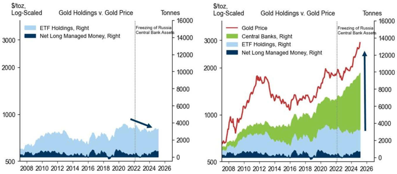 俄罗斯外汇储备被冻结后,央行购金量激增五倍,但这一趋势并未延伸到储量更丰富、价值更低的白银。虽然投资流向逆转时金银可能同步下跌,但只有黄金能获得央行需求的结构性支撑。