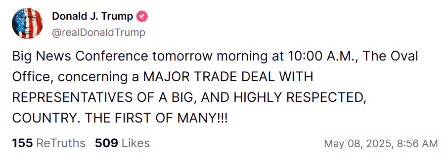 特朗普在“真理社交”(Truth Social)上发表的帖子中说 :“明天上午10点(北京时间今晚10点)将在椭圆形办公室举行重大新闻发布会,内容涉及与一个备受尊敬的大国的代表达成的一项重大贸易协议。这是第一个(达成的协议)!!”