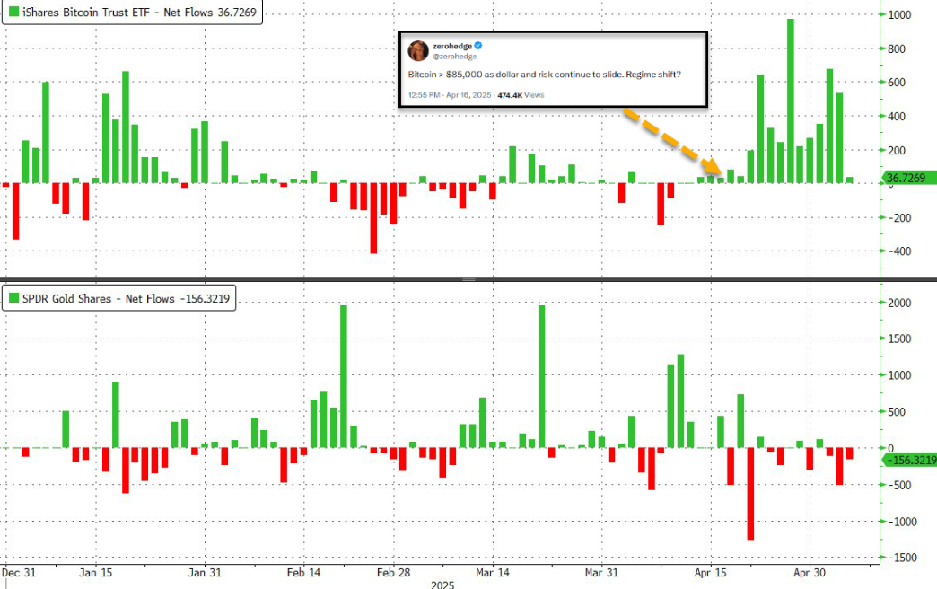 年初至今,黄金价格的涨幅远超比特币。然而,尽管两者表现差异显著,这种巨大的分化并未阻止投资者继续将资金投入比特币——贝莱德的现货比特币ETF(IBIT)的资金流入量已超过SPDR黄金信托ETF(GLD)。