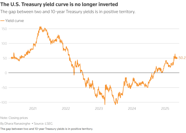 10年期和2年期美债收益率利差自去年以来一直为正。虽然收益率曲线倒挂在历史上被视为衰退预测指标,但曲线通常在衰退临近时恢复正常。
