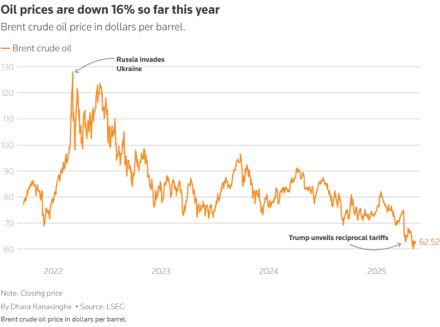 今年迄今油价下跌约16%,至每桶60美元左右。如果这种趋势持续,2025年将是自2020年新冠疫情以来原油表现最差的一年。