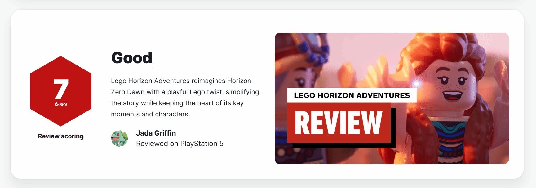《乐高地平线大冒险》的媒体评分已经于今日解禁,IGN为本作打出了7分的评价。简评:《乐高地平线大冒险》以充满趣味的乐高风格重新演绎了《地平线:零之曙光》,简化了故事情节,同时保留了关键时刻和角色的核心精神。