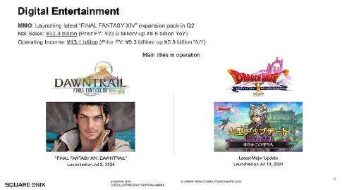Square Enix最新公布的2025财年第一季度(2024年4月至9月)财报显示,公司数字娱乐部门的净销售额同比有所下降,这主要是因为本季度内发布的主机游戏未达到去年同期《最终幻想16》和《最终幻想像素重制》系列的销售水平。尽管如此,《最终幻想14》“黎明之路”扩展包的成功推动了营业利润的增长。