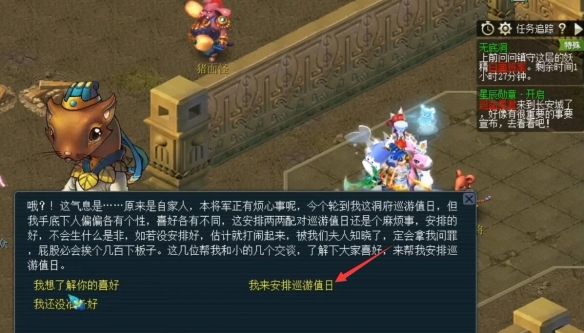 1、和【白面将军】对话选择【我来安排值日】开始小游戏,一共有六个怪;