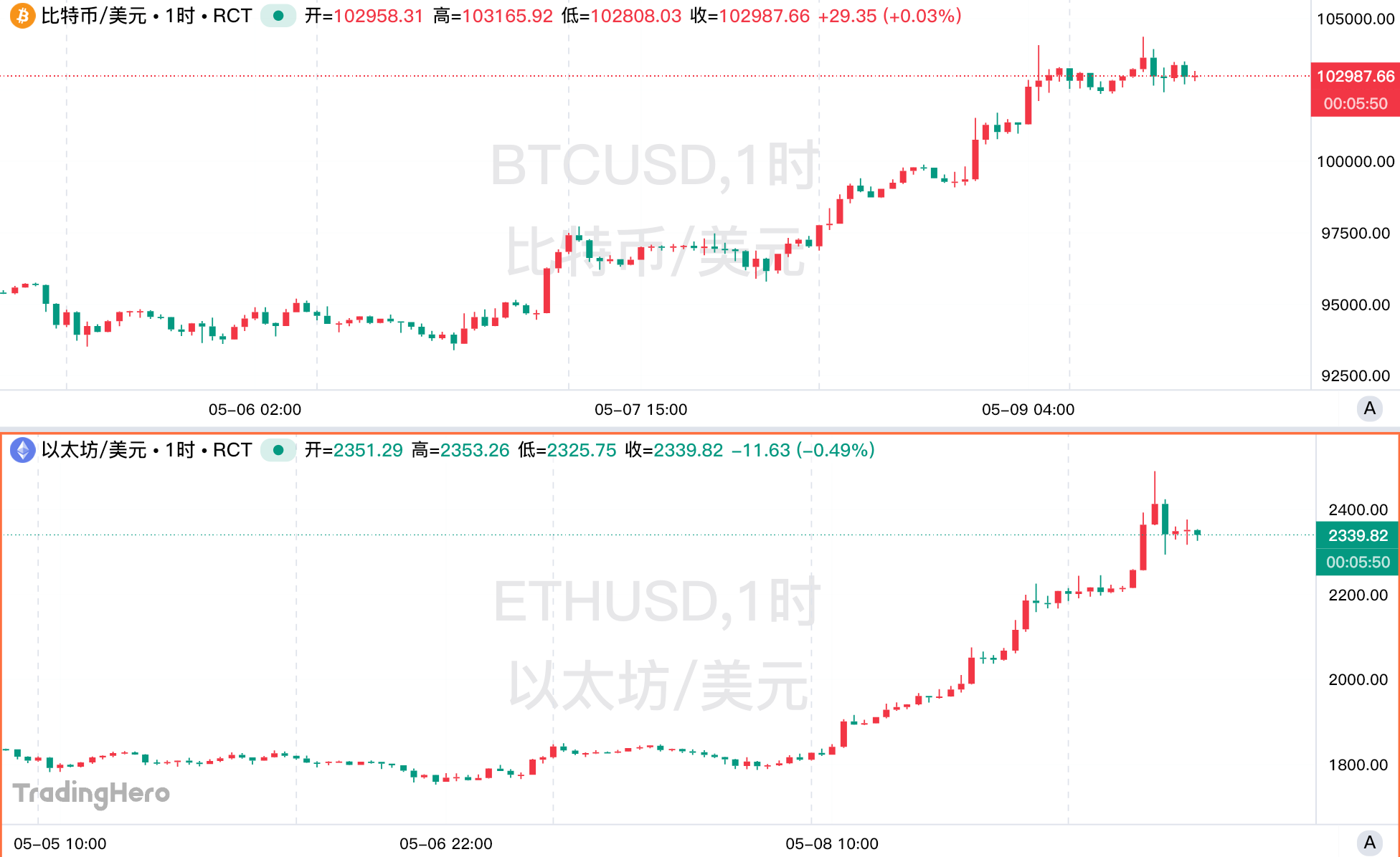 英美贸易协议提振了市场的风险情绪,美股重启涨势,比特币和以太币等风险资产也从中受益。周五,比特币重回10万美元关口上方,为今年2月以来首次,本周料将连续第三周收涨;以太坊周四涨超20%。