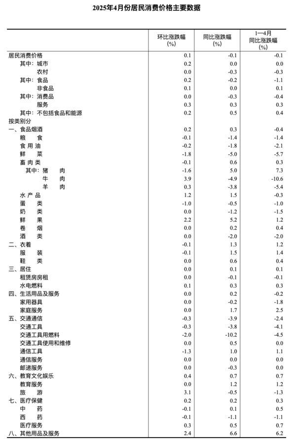 4月份,全国居民消费价格环比上涨0.1%。其中,城市上涨0.2%,农村持平;食品价格上涨0.2%,非食品价格上涨0.1%;消费品价格持平,服务价格上涨0.3%。
