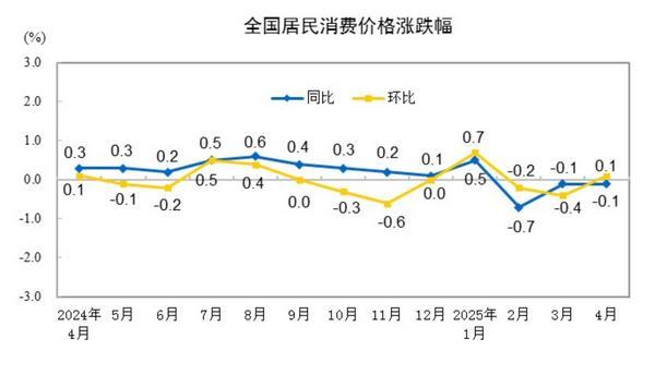 财经5月10日讯 国家统计局5月10日发布数据显示,2025年4月份,全国居民消费价格同比下降0.1%。其中,城市持平,农村下降0.3%;食品价格下降0.2%,非食品价格持平;消费品价格下降0.3%,服务价格上涨0.3%。1—4月平均,全国居民消费价格比上年同期下降0.1%。