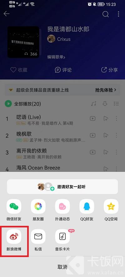 2、在其中就会弹出窗口,在窗口中点击其中【新浪微博】复制歌单链接;
