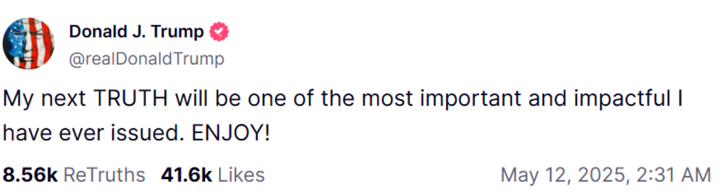 与此同时,美国总统特朗普再发重磅预告。他在北京时间今日凌晨2:31在其社媒发帖称,“接下来发布的帖子内容将是其所发布过的最重要、最具影响力的内容之一,尽情期待吧!”