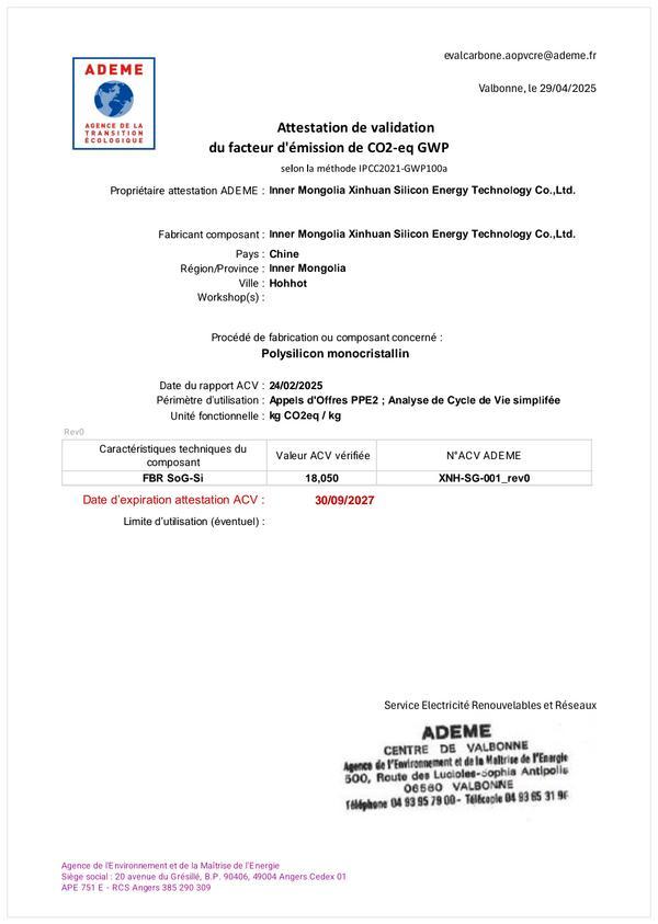 18.050!协鑫科技呼和浩特基地颗粒硅碳足迹获法国能源署认证