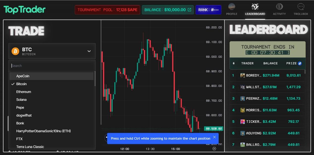 Top Trader正在举办每日交易锦标赛,玩家可以在每天美国东部时间下午3点开始,至次日中午12点结束期间进行参与。每位参赛者将获得10,000 USDN(游戏内货币),玩家可以对多个代币和meme币进行做多或做空的交易。