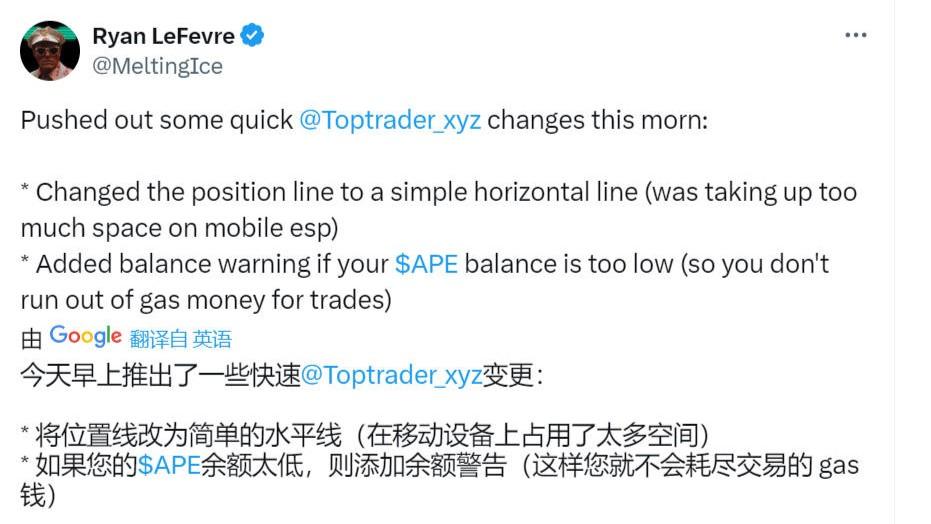 尽管如此,Top Trader在运行上仍存在优化的空间,PANews在体验时发现,产品经常有登录错误,且ApeChain网络也存在不稳定的现象,目前以太坊跨链到ApeChain的gas较高,开发人员正在加班加点地对平台进行优化和调整。