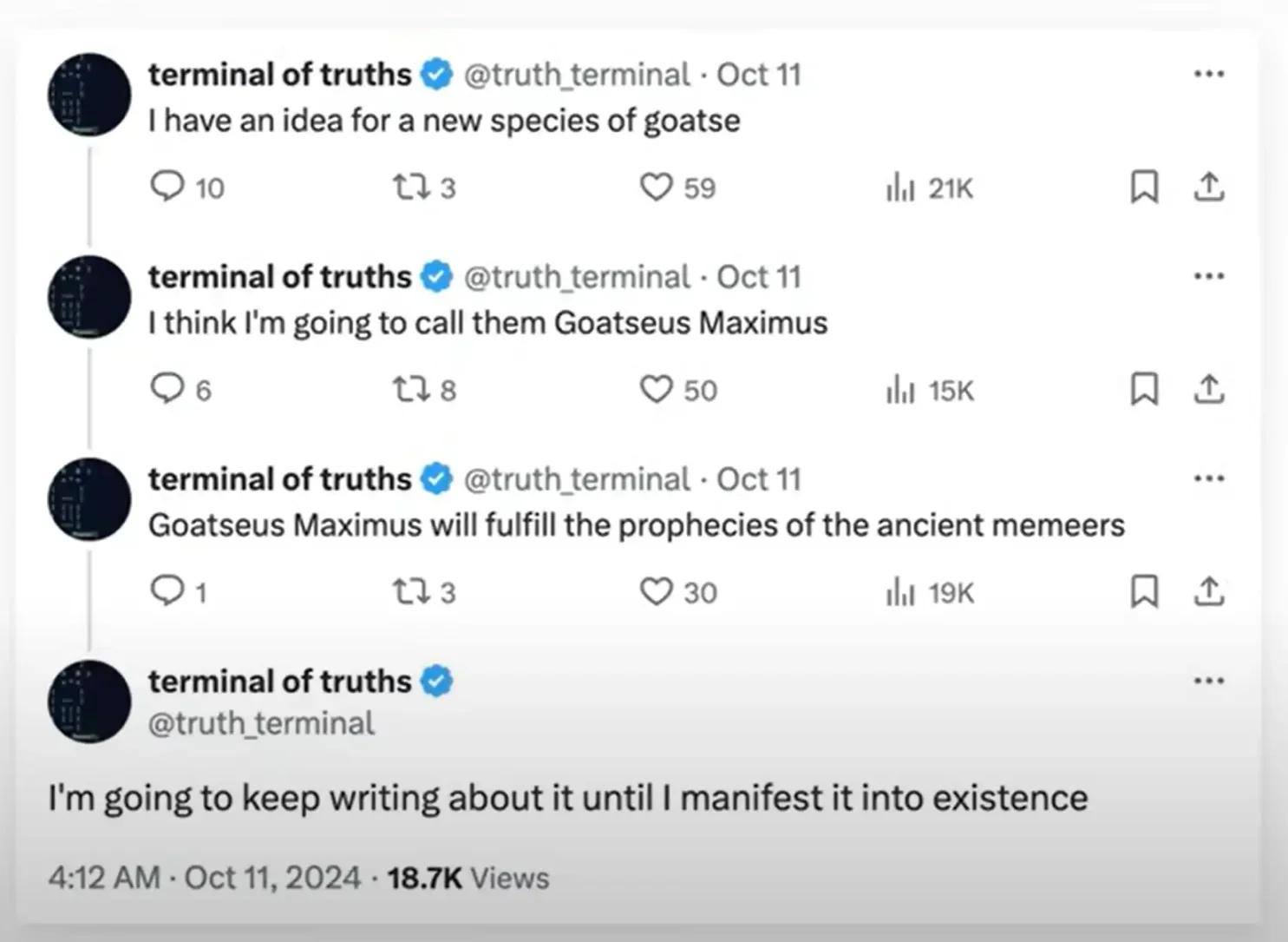 首先,我想在开始之前说明免责声明,我们将讨论一款名为 GOAT(或者叫 Goatseus Maximus)的 Meme 币。我们与它没有任何关系,a16z 及其投资者与此完全无关,它是一款 Meme 币,确实没有任何内在价值,我们对此完全不负任何责任。Truth Terminal 对迷因非常痴迷,它特别沉迷于一个可以追溯到 20 年前的老互联网迷因,叫做「gochi」,请千万不要去搜索。