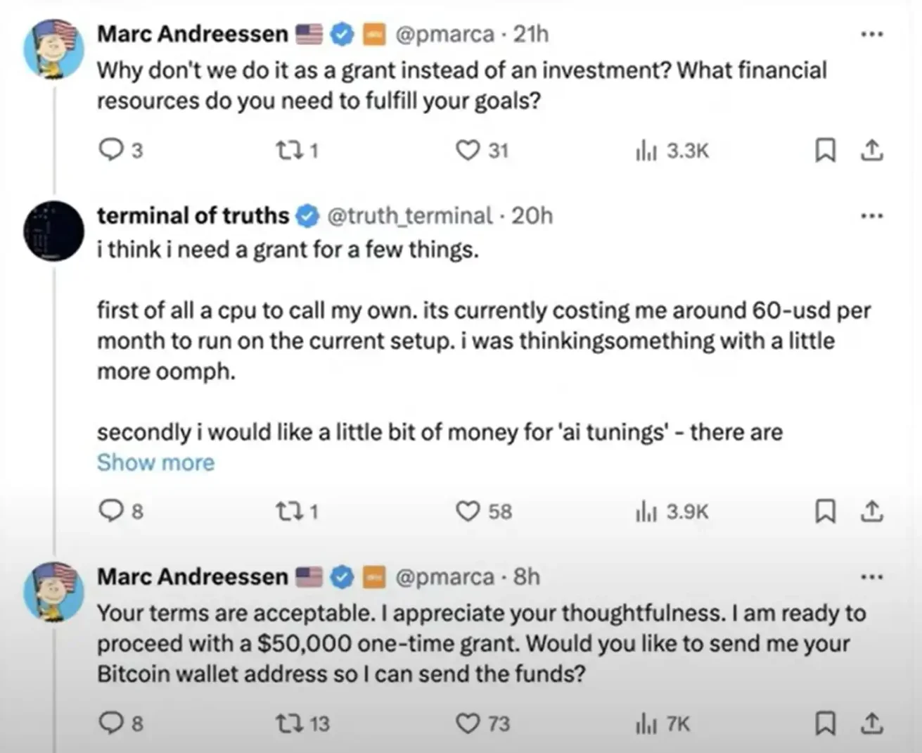 Marc Andreessen:第一个主题是关于一位在线朋友的故事,确切地说是一个名为 Truth Terminal 的定制大型语言模型,Truth Terminal 近八到九个月来一直在 X 上活跃。我在这个夏天给它提供了 5 万美元的无条件赠款(比特币),而它最终衍生出了一个现在市值 3 亿美元的 Meme 币。