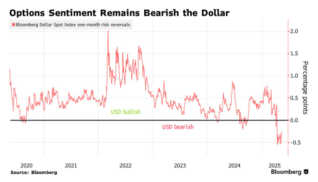 所谓的风险逆转(反映看涨期权和看跌期权之间的需求差异)仍显示出对美元的长期看跌情绪,尽管略低于上周。